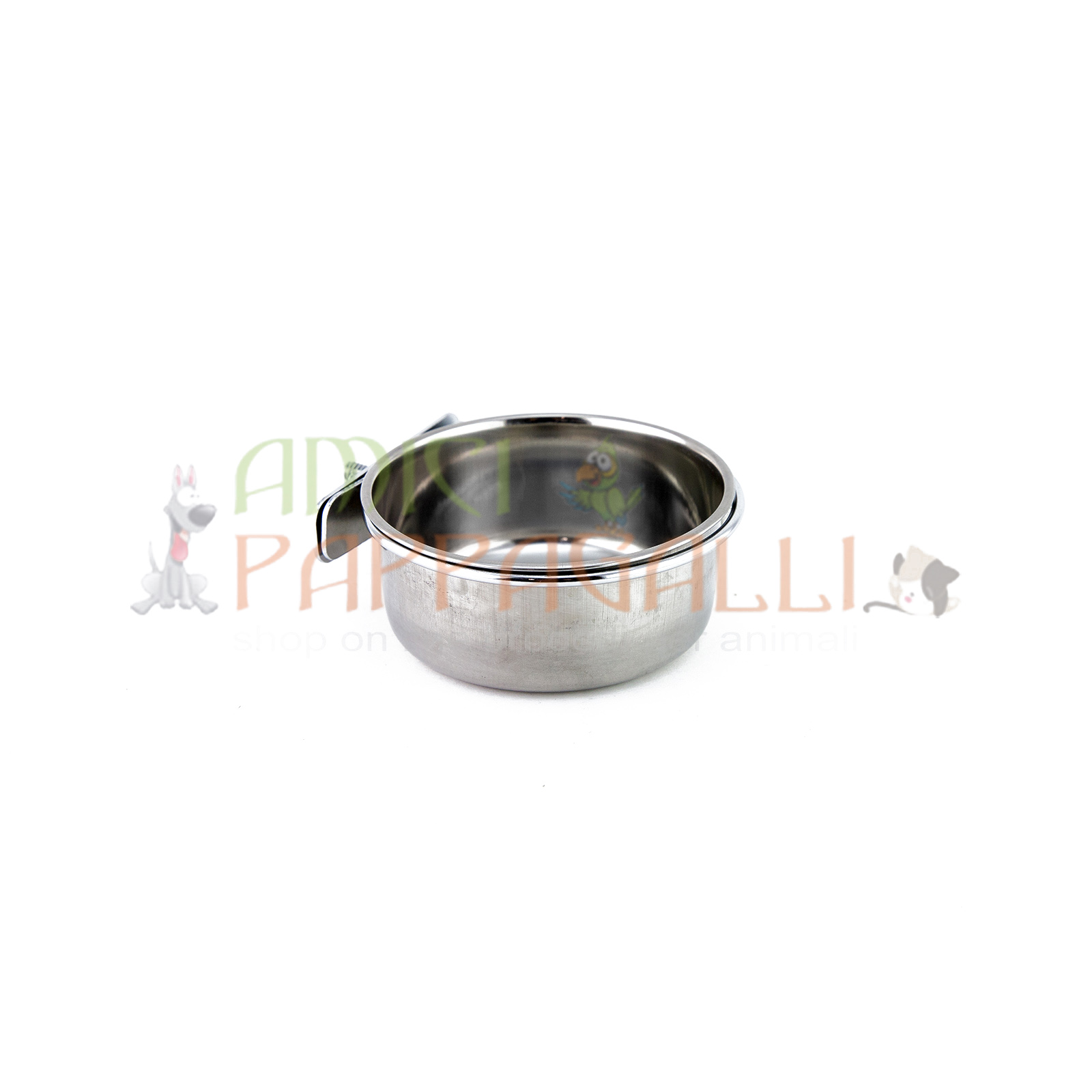 Ciotola in acciaio inox con supporto per fissare la ciotola su una gabbia o voliera, oppure anche in un trasportino.