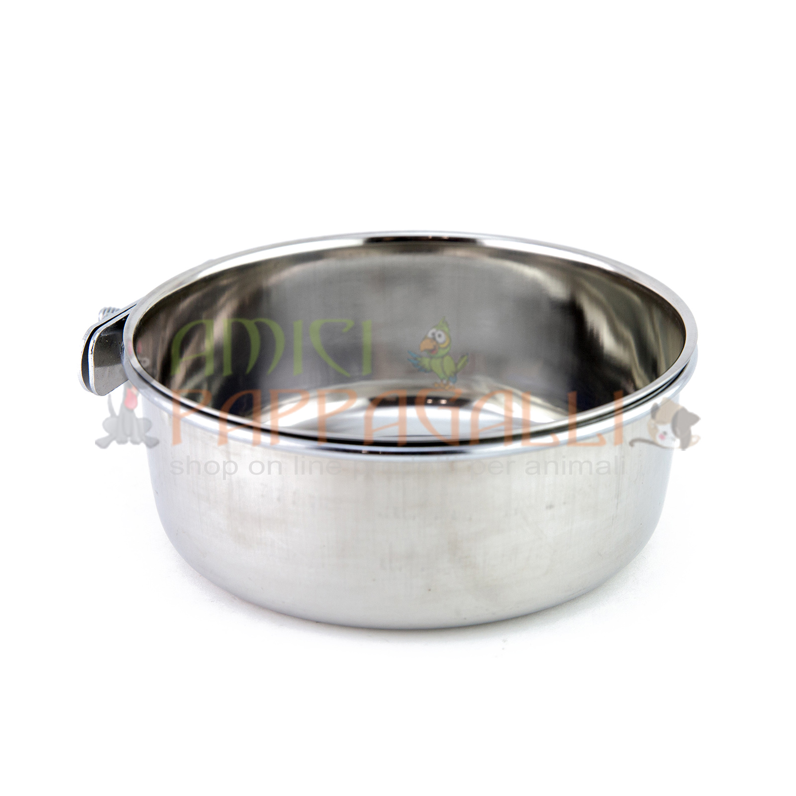 Ciotola in acciaio inox con supporto e morsetto per fissare la ciotola su una gabbia o voliera, oppure anche in un trasportino.