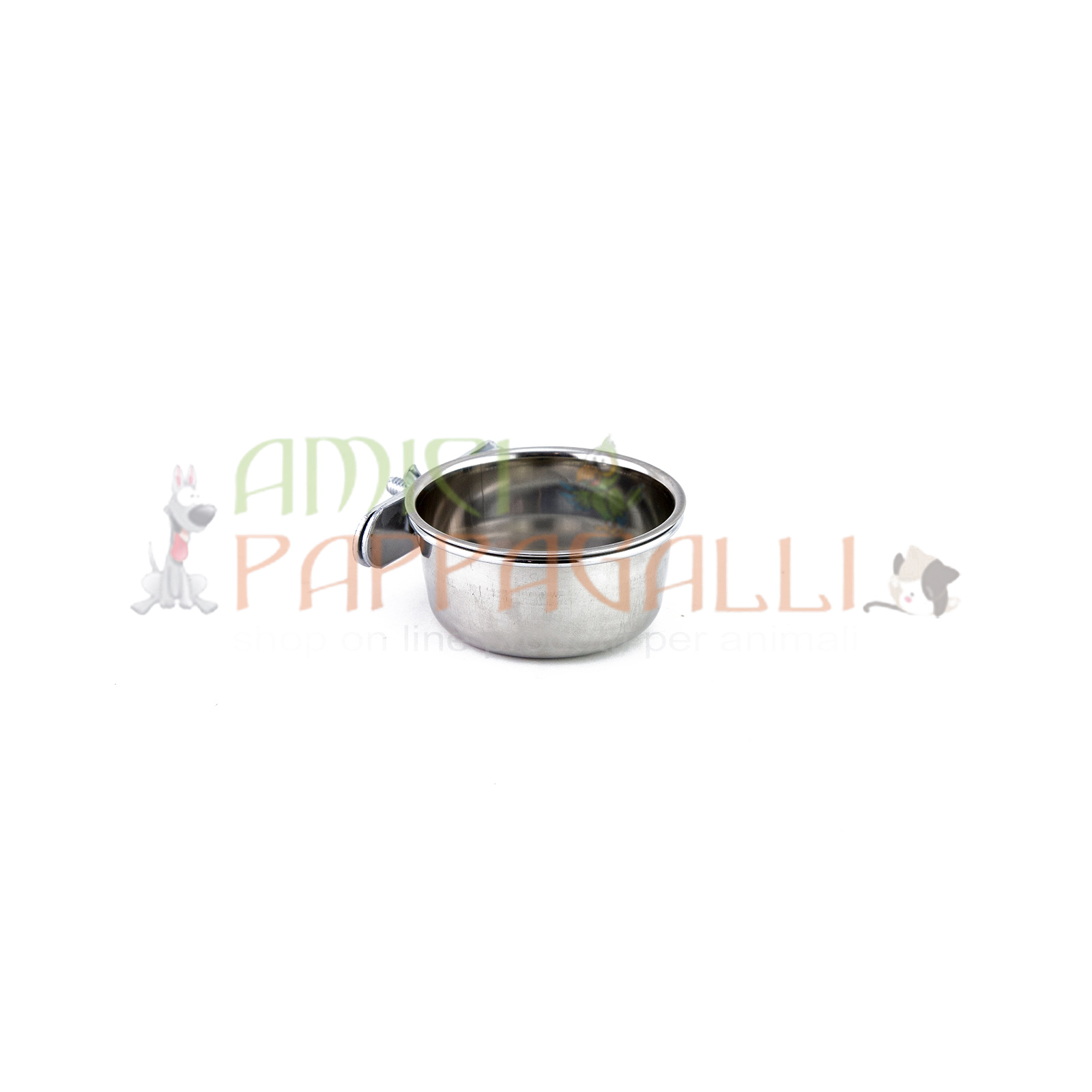 Ciotola in acciaio inox con supporto e morsetto per fissare la ciotola su una gabbia o voliera, oppure anche in un trasportino.