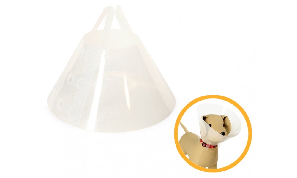 Si tratta di un collare elisabettiano a forma di imbuto, e viene messo attorno al collo dell’animale per evitare che dopo un’operazione possa grattarsi, strappare via i punti di sutura, oppure anche di mordersi la coda se ciò nuoce alla sua salute.