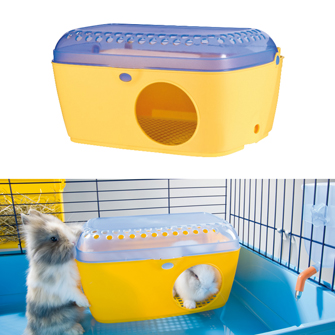 Per roditori, conigli nani, cavie, criceti, in plastica colorata atossica, una bella casetta comoda con tetto arrotondato.