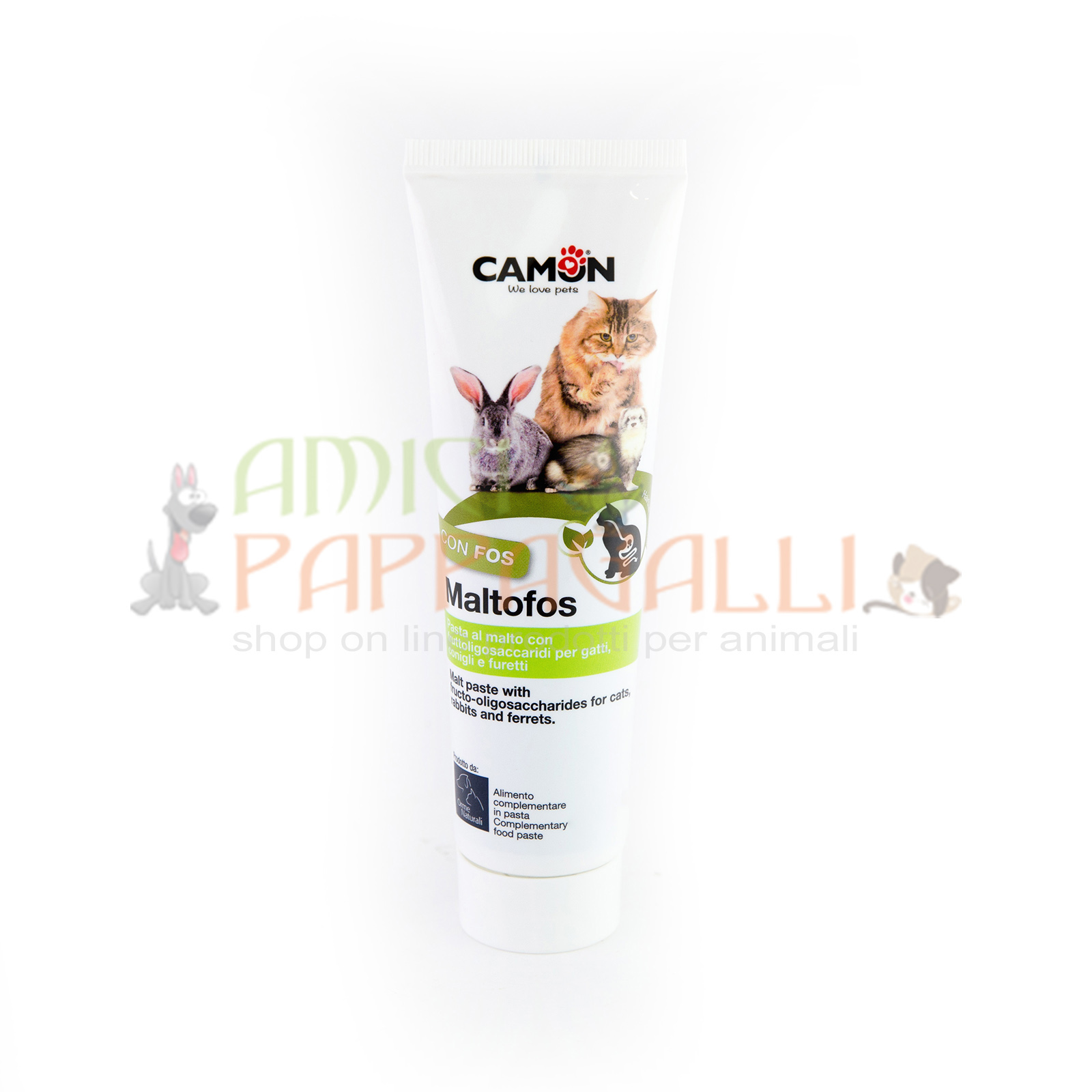 Maltofos è un appetitoso alimento complementare per gatti, conigli e furetti che, aggiunto al cibo o somministrato direttamente, aiuta a mantenere il normale equilibrio della flora intestinale. Inoltre il suo utilizzo favorisce l’eliminazione naturale dei boli di pelo inghiottiti.