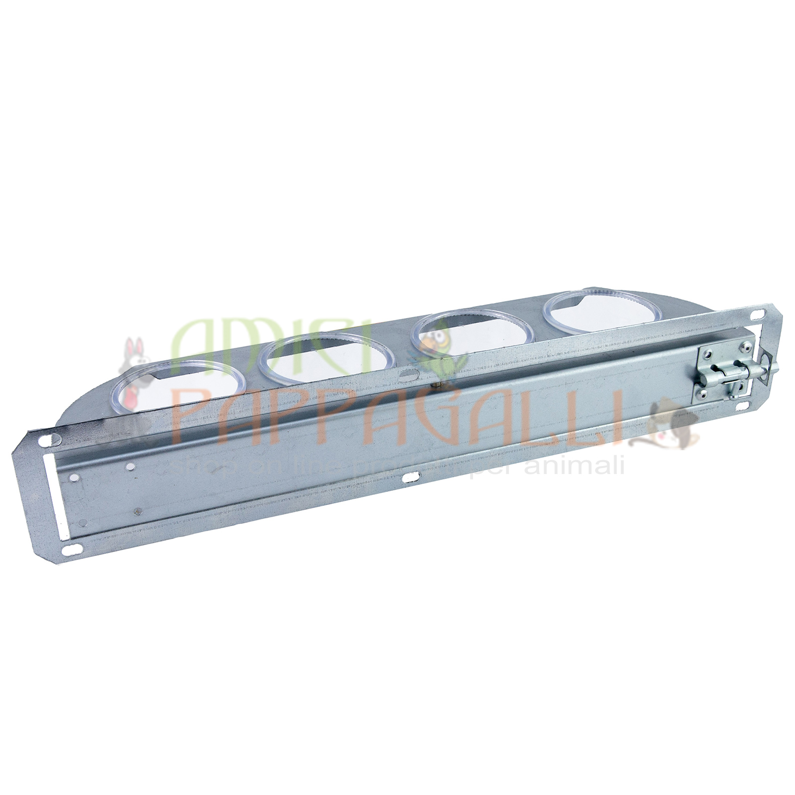 Mangiatoia con girevole zincata dimensioni:Lunghezza 41 cm x altezza 8 cm larghezza 11,50 cm.