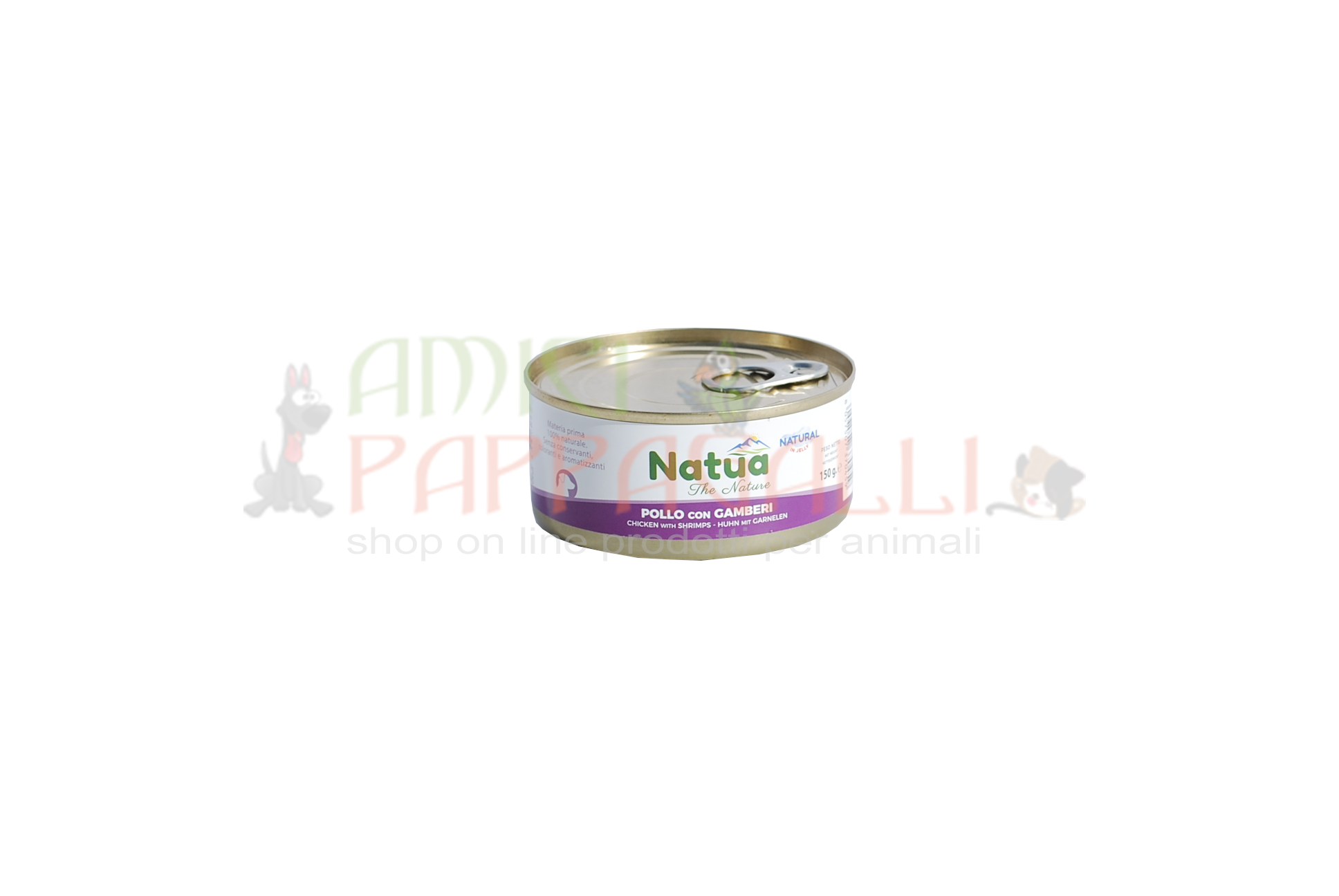 Composizione Natua Pollo con Gamberi: Pollo 62%, Gamberi 4%, Riso 1,6%.