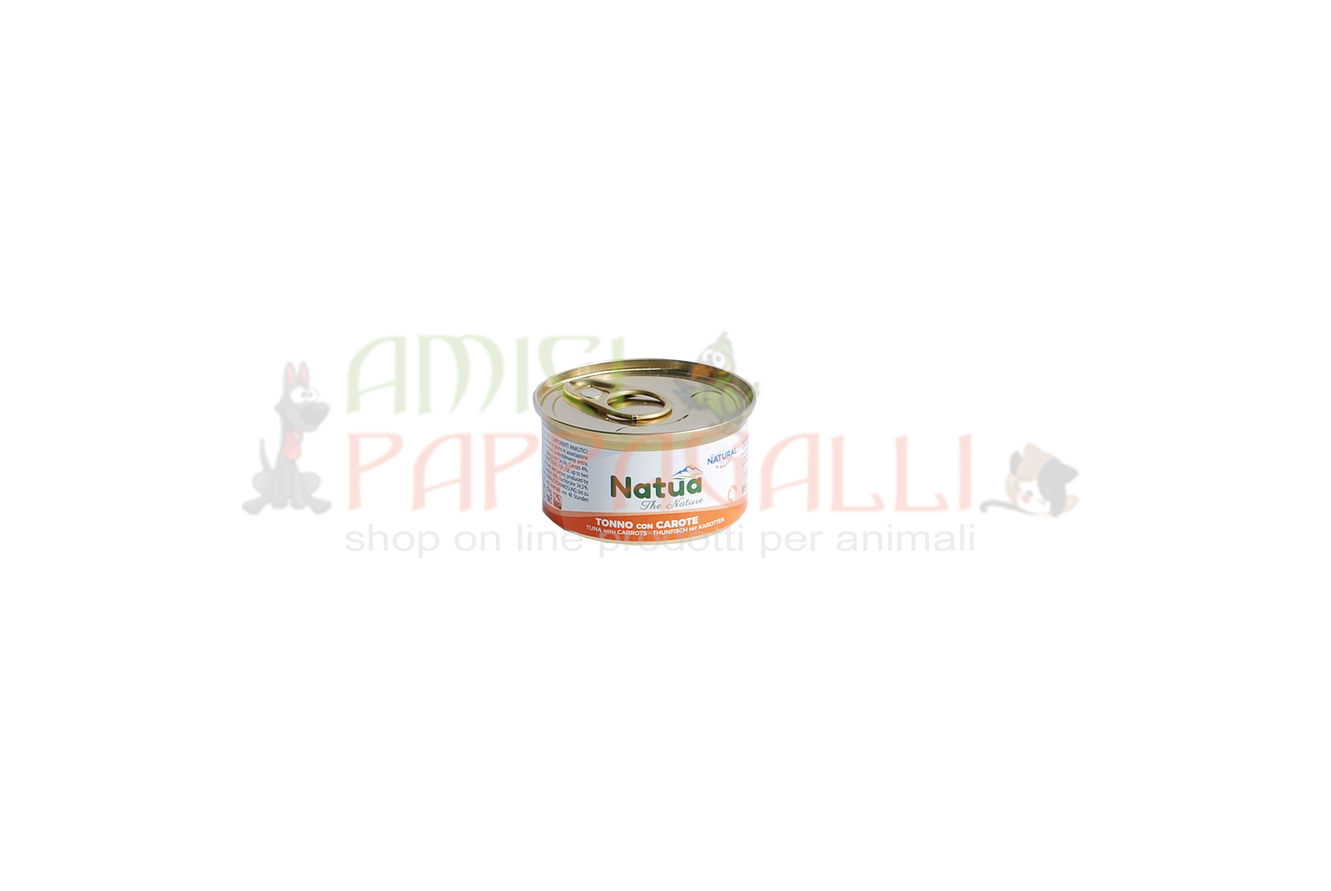 Composizione Natua Tonno con Carote: tonno 60% , Brodo di cottura 34,5 %, carote 4%, Riso 1,5%.