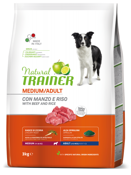 Natural trainer Medium Adult manzo riso, crocchette per cani adulti media taglia.