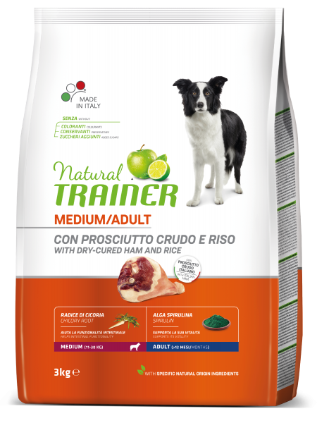 Natural trainer Medium Prosciutto riso 12kg, crocchette cani adulti taglia media.