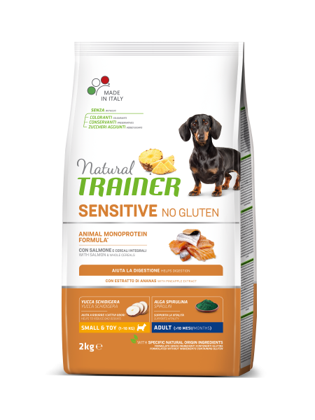 Natural Trainer sensitive no gluten con salmone e cereali integrali 2kg.monoproteico.