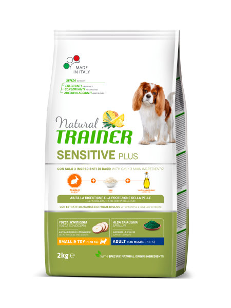 Ingredienti natural trainer sensitive plus: riso 45% , proteine disidratate di coniglio 15% , proteina di riso , olio di granturco 8% , farinaccio di riso , sostanze minerali , semi di lino* , aroma senza proteine animali , estratto secco di radice di cicoria (fonte di inulina)* 0,77% , lignocellulosa , estratto secco di gambo di ananas* 0,1% , estratto secco di foglie di ulivo* 0,05% , estratto secco di yucca schidigera* 0,025% , spirulina (Arthrospira platensis)* 0,02%. , *Ingredienti di origine naturale specifica