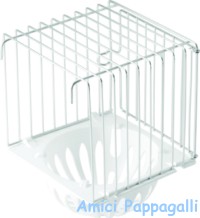 Sono nidi per canarini da agganciare all’esterno delle gabbie: il cestello è in plastica colorata con foggie ferma fondelli, le pareti e il tetto del nido in rete metallica.