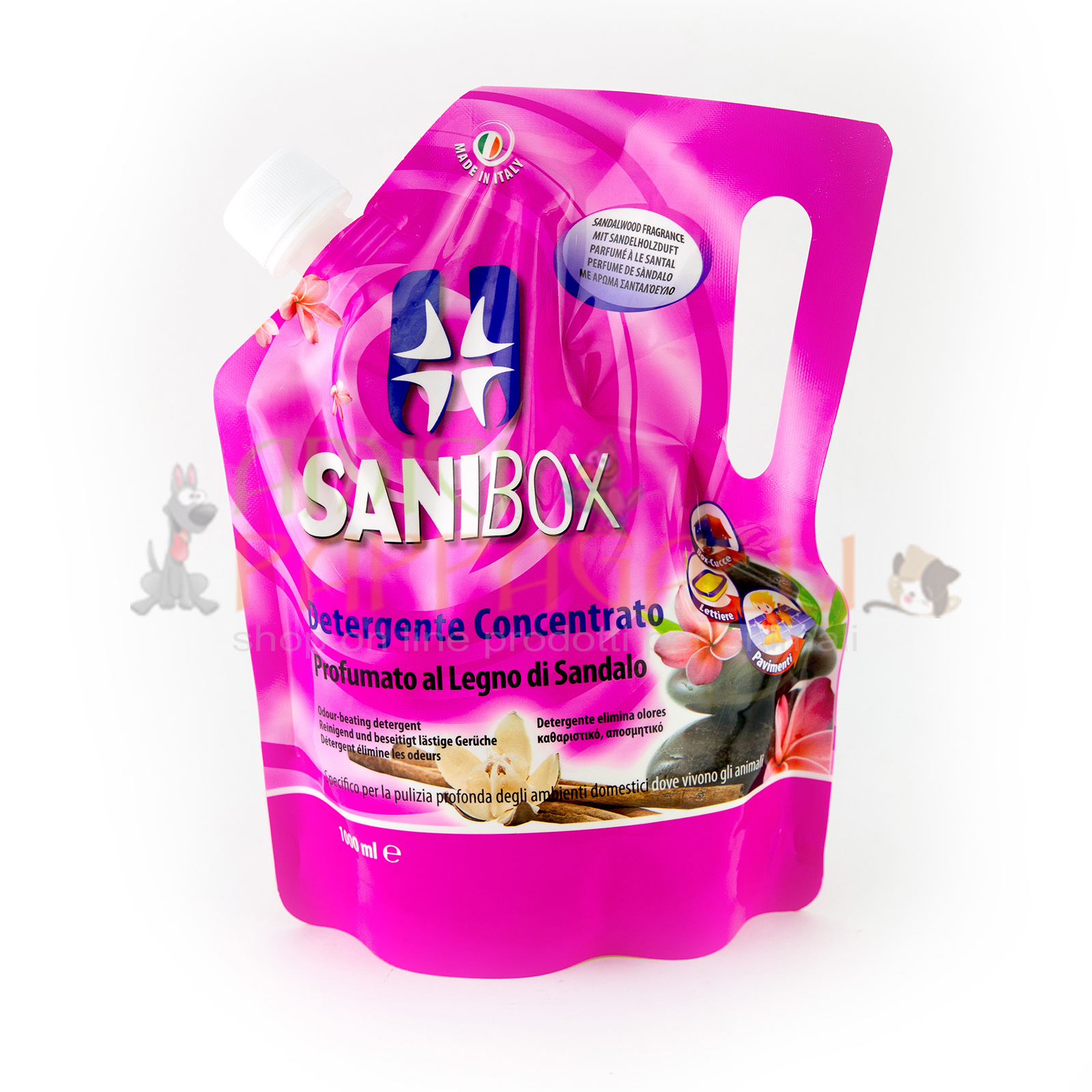 E’ un detergente concentrato in varie profumazioni. Sanibox in legno di sandalo è specifico nel detergere igienizzare e deodorare gli ambienti in cui vivono cani, gatti, uccelli, roditori e tutti gli altri animali domestici
