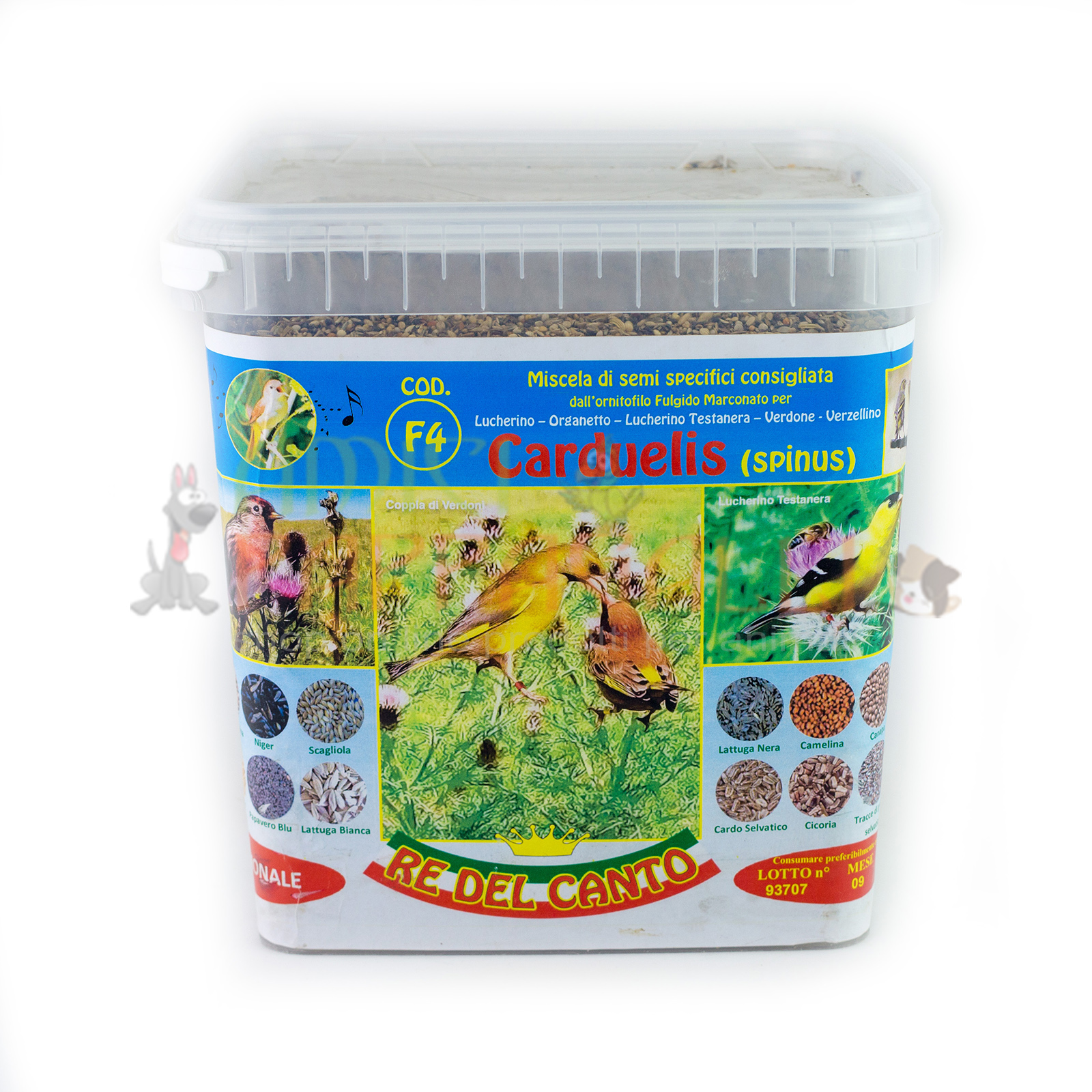 Mangime Spinus Carduelis F4 re del canto Componenti: semi di scagliola, semi di niger, semi di perilla bianca, semi di loietto , semi di lino, semi di canapa, semi di ravizzone, semi di avena decorticata, semi di cicoria, semi di miglio giallo, semi di miglio rosso, semi di colza, semi di erba mazzolina, semi di miglio bianco, semi di panico, semi di bella di notte, semi di camelina, semi di girasole micro, semi di papavero blu, semi di cardo selvatico, semi di prezzemolo, semi di pomodoro, semi di cipolla, semi di finocchio, semi di lattuga bianca, semi di lattuga nera, semi di ravanello.