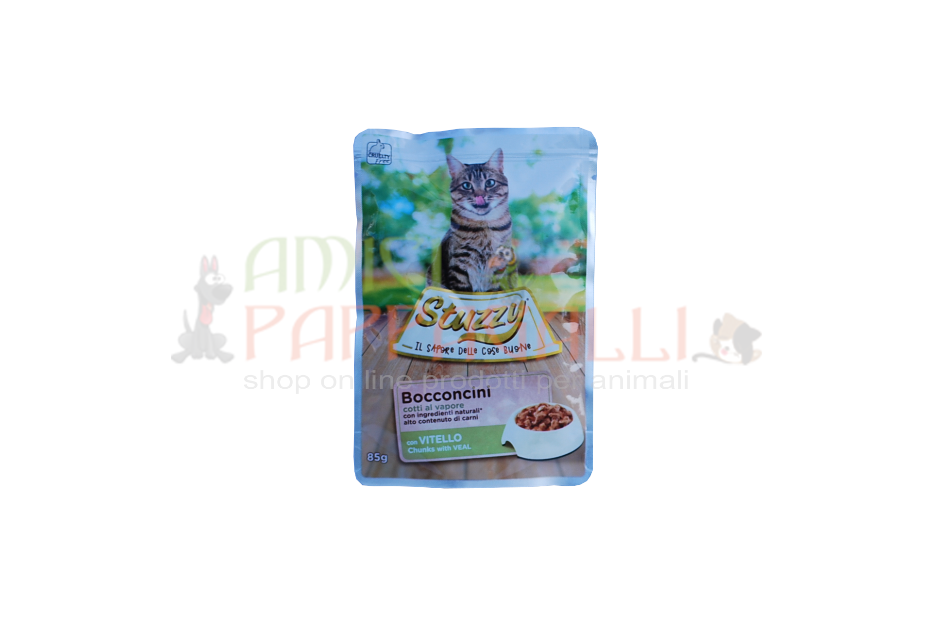 Un cibo, cotto a vapore per gatti adulti, bocconcini senza coloranti e conservanti.