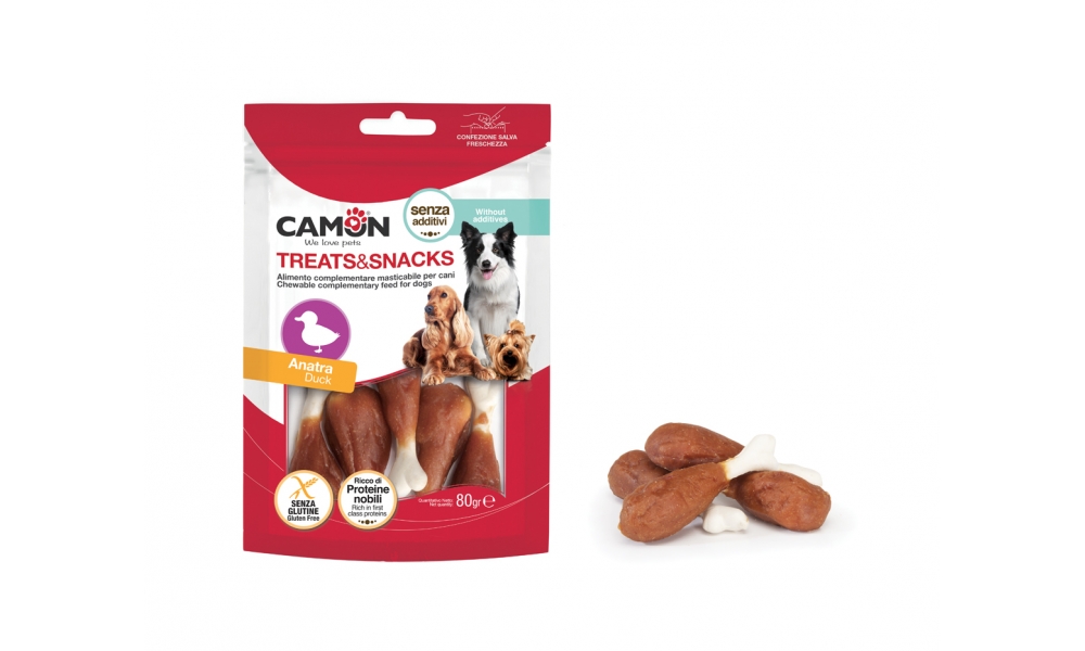Treats snacks sono coscette all’anatra, in confezione salvafreschezza richiudibile.