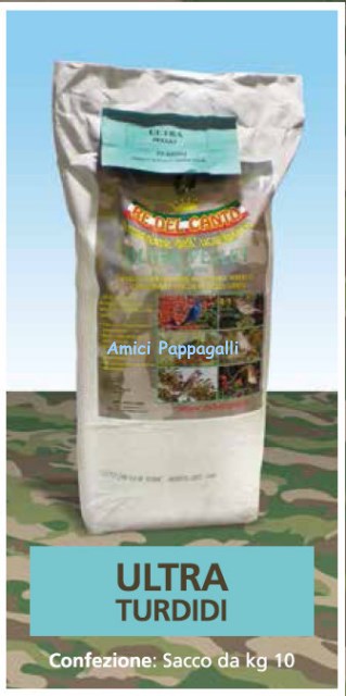 Componenti mangime ultra turdidi – re del canto: farina di granoturco pregelatinizzato (da granoturco geneticamente modificato), farina di estrazione di soia (da soia geneticamente modificata), crusca di frumento, farina di estrazione di girasole, medica disidratata, melasse di barbabietola di zucchero, grassi animali – strutto – frutta disidratata 3%, – uva – dichi – mela, farina di frumento pregelatinizzato, olio vegetale,farina di crostacei e di insetti 1,5%, lievito di birra, uovo disidratato, latte in polvere, carbonato di calcio, sepiolite, DL-metionina, L-lisina, fosfato bicalcico, cloruro di sodio, pollini di fiori, semi e bacche.